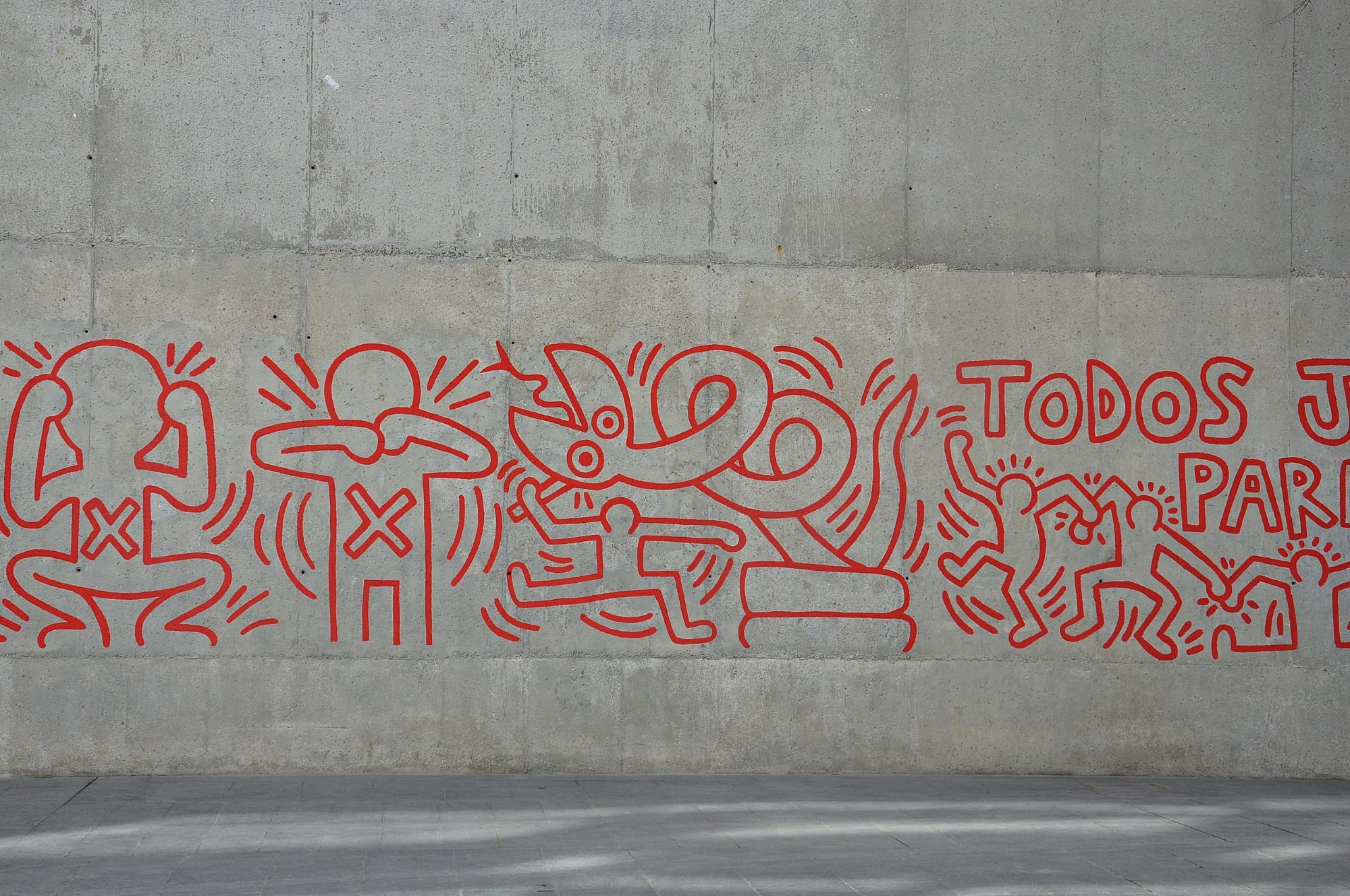Artiste new-yorkais incontournable de l’histoire de l’art, Keith Haring développe un imaginaire graphiquement très reconnaissable, notamment par ses silhouettes aux couleurs vives détourées de noir. Dans sa pratique artistique, il fait souvent participer des enfants à ses créations comme à Tama, au Japon, où des centaines d’enfants réalisent une fresque à ses côtés en octobre 1987.