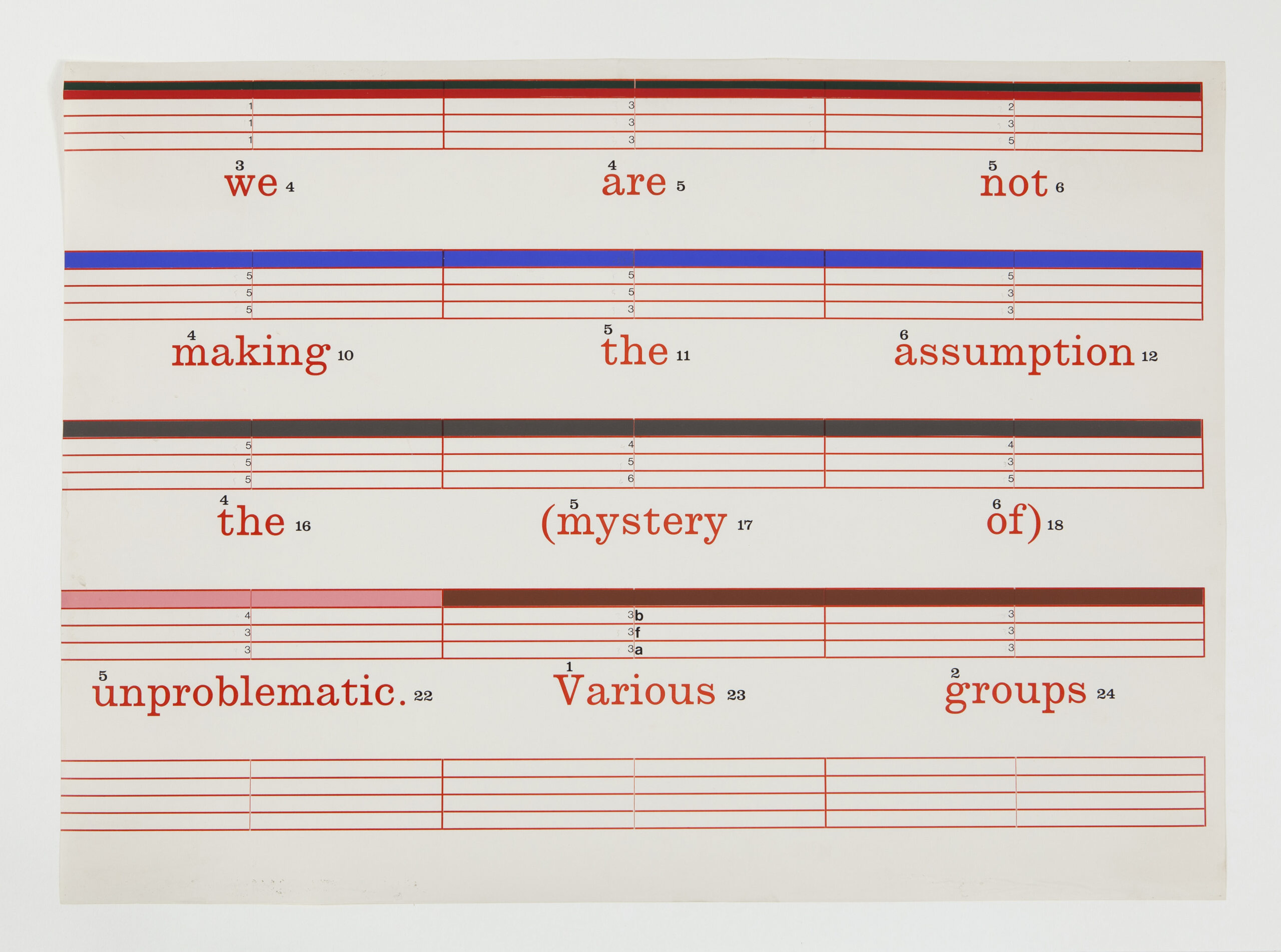 La musique est l’un des fils d’Ariane de l’œuvre de Art & Language depuis leur rencontre avec Mayo Thompson en 1974 jusqu’à aujourd’hui. La musique en tant que langage, en tant que forme d’expression polyphonique, à même de traduire les différentes voix du collectif, est une matrice sans cesse renouvelés.