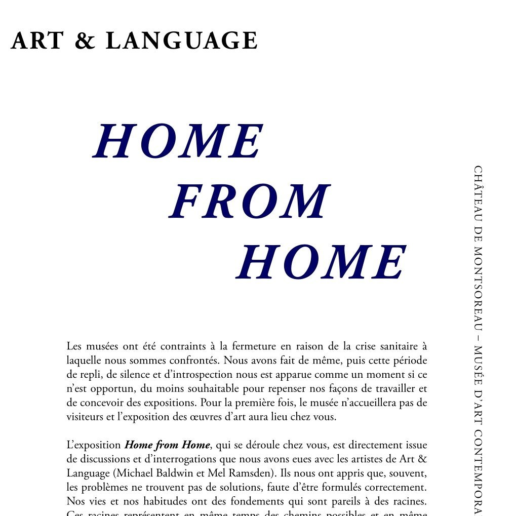 Le kit d’exposition Home from home contient 11 œuvres d’art au format numérique, le livret de l’opéra Victorine, un numéro de la revue Art-Language, deux oeuvres sonores, et 7 œuvres (dessins, peintures, affiche) fragmentées au format A 4 afin d’être réassemblées.